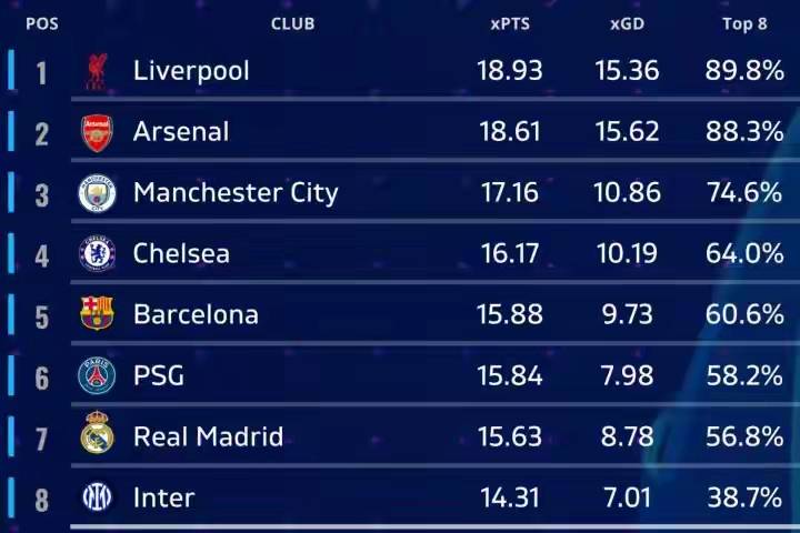 卫冕冠军大巴黎强势领跑,而最接近他的则是当下的英超领跑者阿森纳,巴萨进入三甲,领先利物浦、拜仁、皇马、曼城等一众豪门对手。