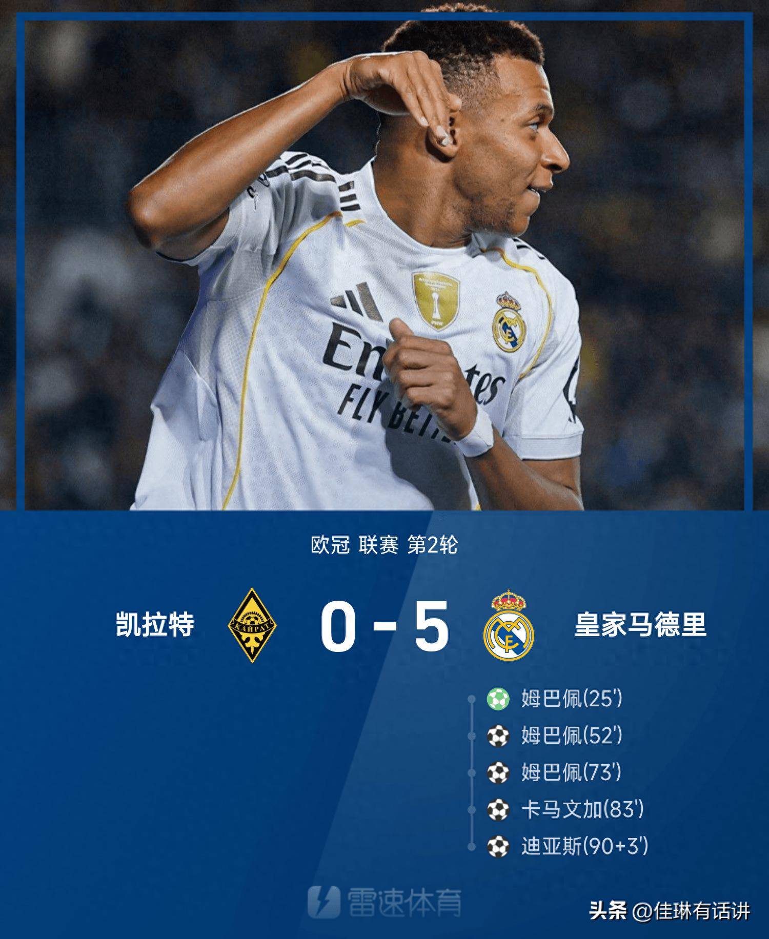 哈萨克斯坦的凯拉特创造历史的杀入了欧冠正赛,这也使得我们离欧冠比赛距离近期的一次,要知道哈萨克斯坦距离我们并不远。不过,对于皇马来说是有够远的,舟车劳顿,不过结果是好的。姆巴佩全场比赛打进3球帽子戏法,卡马文加、迪亚斯破门,皇马5球大胜凯拉特拿到3分。