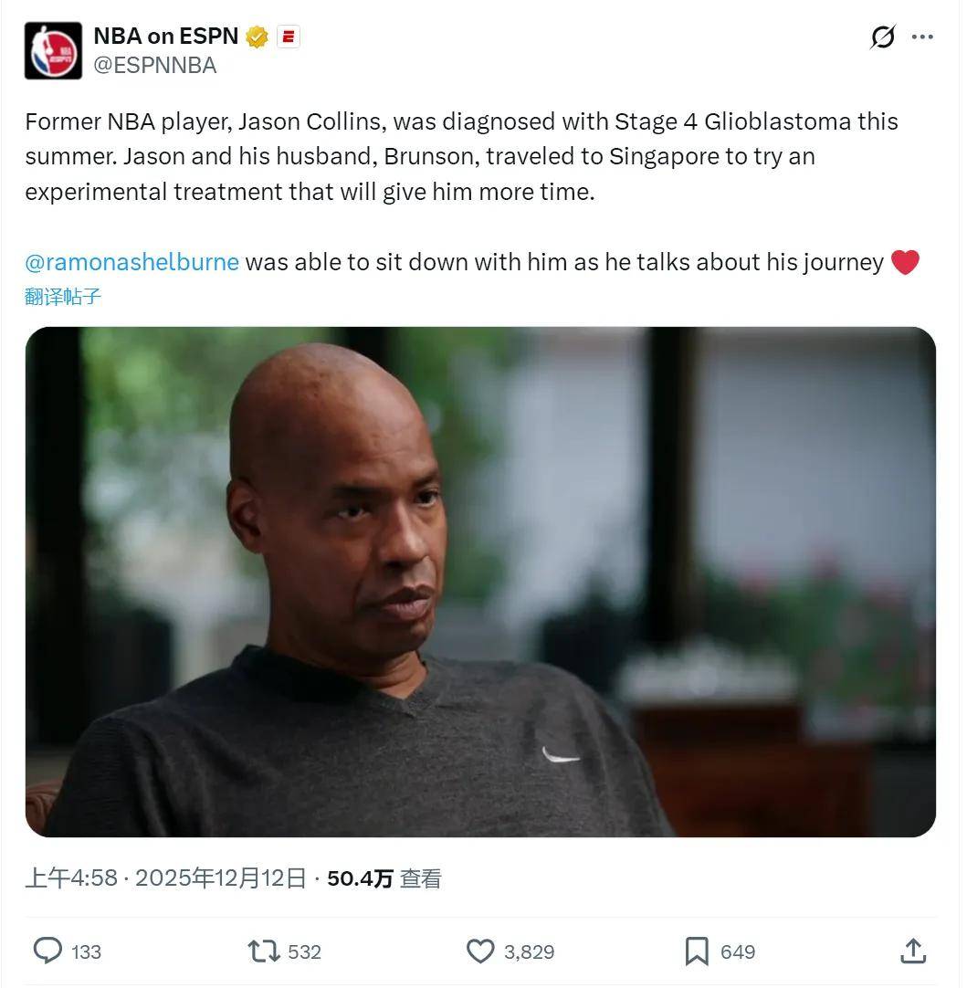 北京时间12月12日,据ESPN报道,NBA宣传大使、前篮网中锋贾森-科林斯被诊断出患有四期胶质母细胞瘤。脑癌四期(IV期)是脑癌中最晚期,科林斯的生命只剩下12个月左右。科林斯和丈夫布伦森-格林前往新加坡,尝试一种新疗法。